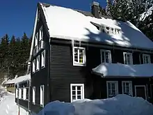 On 17 April 1936, a group of English students from the Strand School, along with their teacher Kenneth Keast, hiked up Schauinsland, attempting to reach Todtnauberg, a challenging hike even in favourable conditions. Severe weather had been predicted, and the group was inadequately equipped and clothed. It was already snowing when they left Freiburg, and despite several local people advising Keast not to walk on Schauinsland in such weather, they went on. Just short of the summit, they were engulfed in a blizzard, and severely lost.[5] Hours later, part of the group finally made it to Hofsgrund, from where a search party immediately set off to rescue the scattered group from storm and darkness. Four of the group of 27 were already frozen to death or had died from exhaustion, and another one was very critical and died on the following day.[6] This tragic event is locally known as the "Engländerunglück", literally "Englishmen’s calamity".