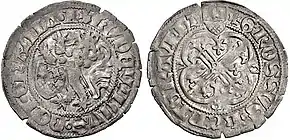 Louis the Peaceful of Hesse (1413–1458), brother-in-law of Saxon Elector, Frederick the Gentle (1428–1464), as the first Landgrave of Hesse had the Schildgroschen minted with the Hessian lion based on the model of the Meissen Schildgroschen. Louis joined the Saxon coin reform in November 1436 and also had high-quality groschen minted that were valued at 20 to the Rhenish Gulden.[3] The large lion shield on his first groschen corresponds to the Schildiger Groschen of Frederick the Meek with the difference that a small crown can be seen above the large shield. The Schildgroschens minted from 1436 are therefore also called Kronichte groschen ("crowned groschen").[4][5] Subsequent crown groschen were coined by Louis I with crowns in the coin design, arranged in a quatrefoil around the lion's shield.[6]