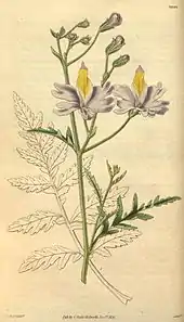 This is an annual plant that grows up to 40 to 60 cm in height, glandulous and sticky, with divided, irregularly parted leaves of 4 to 8 cm in length, the superior leaves are smaller and often whole. The flowers are divided into a number of segments, they are very colourful, shades of violet with yellow patches and a dark line at the divisions between the upper labia. The flowers are comprised on a short, compact, terminal inflorescence. The fruit is a boll that is shorter than the calyx. This and other species of the genus are cultivated in the United States and in Europe. It originates in Chile where is grows in the littoral zone of the provinces of Coquimbo and Aconcagua. It is called the "butterfly of the coast" ("mariposita de la costa").[4][5][6] The seeds do not germinate easily in artificial conditions as they need scarification or manual abrasion to obtain good results.[7]