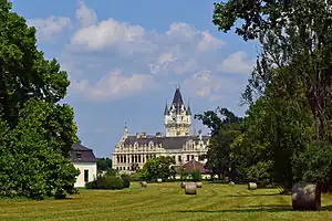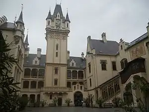 On the west side of the castle, there is a monumental loggia, which was completed in 1863. A few years later, it was decorated with cheerful ceiling paintings and grotesque console figurines. The main tower from 1861 is crowned with so-called bartizans. It is located in front of the west wing towards the castle courtyard. It forms a strong contrast to the slender late Gothic tower opposite on the east side of the castle courtyard.