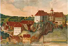 During the Thirty Years' War, the castle was besieged by Swedish troops in 1632, and retaken by the Imperial troops in the following year. During the attack by Imperial troops under General Horn, the eastern section of the castle was destroyed by fire.[6]