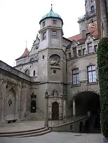 In 1893, the eastern wing burned and was nearly totally destroyed.[2] Starting in 1895, the construction manager Johannes de Pay and the Munich architect Emanuel von Seidl rebuilt the destroyed section. In 1899 and 1906, other sections of the castle were redone in the eclectic style (a combination of Romanesque, Gothic, and mostly Renaissance styles) that was common at the time. The Portuguese Gallery (German: Portugiesische Galerie) was built during this reconstruction.[2] The construction continued under Leopold's son, Wilhelm (1864–1927) who was prince of the Houses of Hohenzollern-Sigmaringen and Hohenzollern from 1905 until 1927.