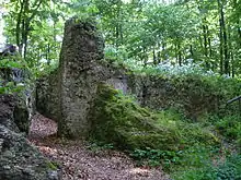 The castle stood on the site of a prehistorical fortification, probably a hill settlement of the Urnfield culture of the late Hallstatt era or early La Tène period.[4] Traces of it may be seen in the sector rampart and outer ditch west of the levelled castle.