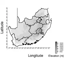 Schoenus loreus generally occurs within 200 km of the south-eastern and south coasts of South Africa.[1] A collection has been recorded from Mpumalanga Province, but is it It is unclear whether that specimen was collected from there or was mislabeled.[1]