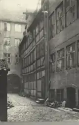The building is four storeys tall and five bays wide. The gate opens to a narrow, cobbled courtyard. It is to the southwest defined by two consecutive side wings, one in brick and one with timber framing, and to the south east by a rear wing. The last side of the courtyard is defined by the side wing and rear wing of the Jennow House at No. 12.[24]