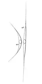 Schroederia consists of solitary cells that are needle- or spindle-shaped. They may be straight or curved. The cells end in long spines; at one end the spine may be bifurcated. Cells contain a single parietal chloroplast and one or several pyrenoids.[4] As the cell matures, it develops multiple parietal chloroplasts along its long axis.[5] Cells have one nucleus (uninucleate) when young but may become multinucleate.[1]
