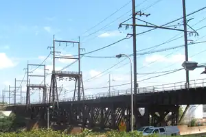 Schuylkill Arsenal Railroad Bridge is a wrought iron, two-track, deck truss swing bridge across the Schuylkill River between the University City and Grays Ferry neighborhoods of Philadelphia, Pennsylvania.[1] It was built in 1885–86 by the Pennsylvania Railroad. Today, its swing span has been fixed shut, and the electrical catenary de-energized.