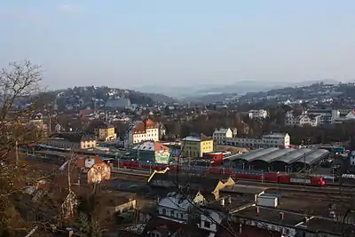The first official trial run on the Schorndorf–Gmünd section of the Rems line was held on 29 June 1861 in a festive atmosphere with great general interest. An official opening trip with guests of honour was held on 18 July 1861 and on 25 July scheduled services began between Stuttgart and Wasseralfingen.[7] The station tracks initially included 25 sets of points, a turntable and a water station with two water cranes.[4] A ticket from Gmünd to Stuttgart cost, in second class, 81 kreuzers and, in third class, 51 kreuzers.[8]