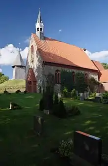 The Lutheran St. James' Church (German: St. Jakobi-Kirche) was erected around 1160 in Romanesque style from boulders, but later often altered. It is decorated by a carved altar of an unknown artist of about 1520. It stood originally in Husum and Schwabstedt acquired it in 1834 together with paintings of the Twelve Apostles and scenes of the Passion of Jesus. They are pieces of the Tönning-based Dutch painter Govert van Achten, who created them in 1602. Bishop Ulrik donated the carved pulpit, by Hans Pepper from Rendsburg, and the wooden baptismal font in 1606. His many titles and coats-of-arms cover pulpit and font.