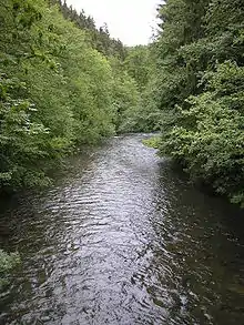 The Schwarza valley (German: Schwarzatal) parallels the axis of the Schwarzburg anticline (Schwarzburger Sattel), a structure that divides the Thuringian Forest to the northwest from the Thuringian Highland to the southeast.[1] The Schwarzburg Anticline was created by the collision between Laurentia and Gondwana around 350 million years ago.[2] The rock of the Schwarzburg Anticline is metamorphic, with a core of ordovician rock, largely quartzite. The river is geologically unusual for the large number of kolks in its lower course.
