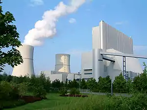 Black Pump power station (German: Kraftwerk Schwarze Pumpe, literally 'power station Black Pump') is a modern lignite–fired (brown coal) power station in the Black Pump (Schwarze Pumpe)[lower-alpha 1] district in Spremberg, Germany, consisting of 2 × 800 megawatts (MW) units. Built by Siemens, the current plant came into service in 1997–1998. On 30 September 2016, Vattenfall sold the power station to the Czech energy group EPH and its financial partner PPF Investments.[1] The cooling towers are 161 metres (528 ft) high and have an observation deck on top.