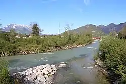 Mouth of the Schwarzlofer (from bottom right) into the Großache (from bottom left to top right), in the background the Kaiser Mountains