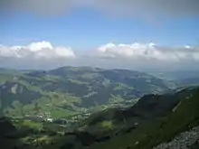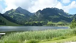 Schwarzsee (German: [ˈʃvartszeː]) or Lac Noir (French: [lak nwaʁ]; English: "Black Lake";[1][2][3] rarely Lac Domène; Arpitan: Lèc d'Omène [ˈle dɔˈmɛn(ə)] ⓘ), is a small lake in the Canton of Fribourg, Switzerland with an area of 0.47 km2 (0.18 sq mi). The lake in the Swiss Prealps is bordered by the peaks of Schwyberg (1,628 m) in the West, Les Reccardets (1,923 m) and Spitzfluh (1,951 m) in the South, as well as Kaiseregg (2,185 m).