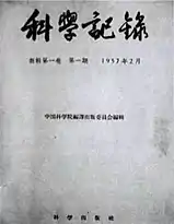 After the establishment of the People's Republic of China, Science Record continued to be published by the Chinese Academy of Sciences.[9] On 31 October 1952, it was merged into the foreign language edition of Acta Scientia Sinica[10] and resumed publication.[11]