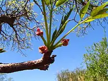 The trees are dioecious. Male trees produce multiple male flowers on a terminal raceme. These have red sepals and petals, and about 20 stamens per flower. On rare occasion a male flower can produce a gynoecium, turning it bisexual. Female flowers grow individually on their own pedicel and have staminodes.[4] The leaves are alternate, compound, and imparipinnately divided. The leaflet shapes range from round to elliptical.