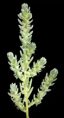 This chenopod is an erect perennial, growing to 30 cm high, which is covered all over with long soft silky hairs.[7] The fleshy linear leaves are 10–20 mm long.[7] The flowers are solitary but cluster at the apex of the branches.[7] There are 5 stamens. The tube is a short inverse cone 1–1.5 mm high, with a square, truncated apex.[7] There are five spines in a 3+2 arrangement, which are positioned at the corners of apex, with one pair close together and often appearing to be one spine.[7]