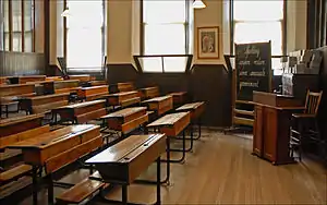After the Reformation there were a series of attempts to provide a network of parish schools throughout Scotland. By the late seventeenth century this was largely complete in the Lowlands, but in the Highlands elementary education was still lacking in many areas.[1] These schools were controlled by the local Church of Scotland and provided a basic education, mainly to boys.[2] By the eighteenth century many poorer girls were being taught in dame schools, informally set up by a widow or spinster to teach reading, sewing, and cooking.[3] The Statistical Account of Scotland undertaken parish-by-parish by John Sinclair in the 1790s indicated that all but the oldest inhabitants were expected to be able to read and that many (although fewer girls) could write and count. However, it also indicated that much of the legal provision of schooling had often fallen into decay.[2] In the burghs there were a range or parish schools, burgh schools and grammar schools, most of which provided a preparation for one of the Scottish universities. These were supplemented by boarding establishments, known as "hospitals", most of which had been endowed by charities, such as George Heriot's School and the Merchant Companies Schools in Edinburgh.[4] The Industrial Revolution and rapid urbanisation undermined the effectiveness of the Scottish church school system, creating major gaps in provision and religious divisions would begin to undermine the unity of the system.[5] The publication of George Lewis's Scotland: a Half Educated Nation in 1834 began a major debate on the suitability of the parish school system, particularly in rapidly expanding urban areas.[6]
