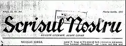Scrisul Nostru was a monthly literary magazine published in Bârlad, Romania by the Academia Bârlădeană". The first issue of the magazine was issued in January, 1929 and it appeared, with some irregularity, until October 1931, a total of 21 numbers were printed.