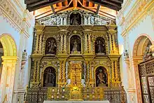 "There was a larger altarpiece with six images, plus one of Our Lady and a gilded Saint Michael; above the tabernacle, a painting of Our Lady, two little tables with images of Saint Michael, Saint Ignatius, Saint Raphael, Saint Gabriel, and Saint Anthony. Next to the gospel were two gilded altarpieces, and on another, also gilded St. Ignatius, St. Michael, and St. Roque. On another median altar, two images of Our Lady and one of St. Barbara, all gilded; on a small altar, the image of St. Isidro, gilded."[64]