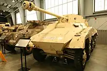 Protracted engine development meant that the desert campaign was over before the 234 arrived, but it nevertheless proved useful on the Eastern and Western Fronts.[5] It was quite formidable, but not many were built before it was replaced by the simpler 234/1, with a 20mm gun, in 1944.[7] The Sd.Kfz. 234 was commonly used in pairs, one equipped with a long-range radio communications kit while the other possessed only a short-range radio. The long-range unit was identifiable by the large "star" antenna on the left side of the vehicle.
