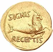 Roman aureus coin with Capricorn as a sea goat minted in 19 BC by Emperor Augustus[1]