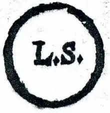 Originally, only a wax seal was accepted as a seal by the courts, but by the 19th century many jurisdictions had relaxed the definition to include an impression in the paper on which the instrument was printed, an embossed paper wafer affixed to an instrument, a scroll made with a pen, or the printed words "Seal" or "L.S." (standing for the Latin term locus sigilli meaning "place of the seal").