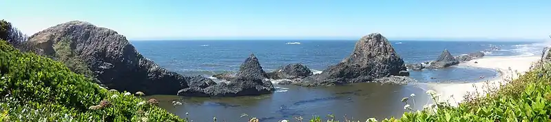 Panorama of the view looking north from Seal Rock State Recreation Site