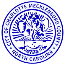 The Seal of Charlotte was first established during the tenure of mayor Charles A. Bland, and was designed over a period stretching from 1911 to 1915. It was adopted on the city's first flag in 1929, which still remains in use today. This seal itself was rescinded at an unknown date and replaced with the present one.[1] It is used to authorize executive documents from the city, including, but not limited to, mayoral proclamations and resolutions from the city council.