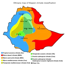 Kiremt is the rainy season when 85% to 95% of food crops are produced.[8][9] Covering from June to August, the season is marked by frequent rains and homogeneous temperatures.[10]