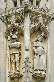The memorial is in the Perpendicular Gothic style and is built of Ketton stone. It stands on an octagonal stepped base, and its upright is also octagonal, with buttresses and topped with finials. Its top is in a lantern form, and atop that is a cross and small shield. The front has eight niches, holding a statue representing different forces: a sailor, cavalryman, artilleryman, infantryman, imperial yeoman, militiaman, volunteer and nurse.[1][3] The initial statue of a sailor showed him holding a Lee-Enfield Magazine Rifle Mark I, which was rejected as overly aggressive, and instead installed at the library in Lichfield.[4][2]