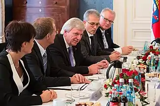 ![]() The inaugural meeting of the second Bouffier cabinet on 18 January 2014. From left to right: Lucia Puttrich, Axel Wintermeyer, Volker Bouffier, Tarek Al-Wazir, and Thomas Schäfer | |