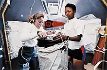 Mae Jemison (right) works in space with Jan Davis in 1992; in 1993 Jemison had a cameo in this episode of Star Trek