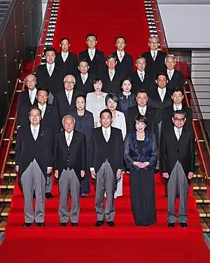 As of 2023, Kishida has led four cabinets since the beginning of his premiership in October 2021. His first cabinet lasted just 38 days, and was formed following the resignation of former Prime Minister Yoshide Suga's cabinet. After receiving a mandate in the 2021 general election, Kishida formed his second cabinet in November 2021. He reshuffled it twice, the first time being in August 2022 in the wake of the assassination of former prime minister Shinzo Abe, and the second in September 2023. The second reshuffle includes more women, while also keeping potential political rivals in key roles and positions.[2] In total, eleven first time appointees were introduced in the cabinet.[3]