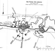 Meanwhile, the defenders were reinforced by Wnorowski's troops and pushed back the Bakony brigade.[10][3] The Wollenhofer Brigade retreated, and it was probably at this time that the Tolna National Guardsmen ran away from the fire of their Serbian guns in the direction of the Bácsfeketehegy road.[11] The natural consequence of this was that the Serbs not only poured from the bridgehead and the trenches of Óbecse (which, from the start of the battle, was not a target of the Hungarian attacks) to the Verbász entrenchments, driving back the Alexander infantry.[11]