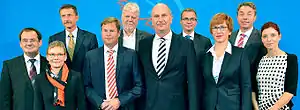 ![]() The members of the second Woidke cabinet in March 2016. Left to right: Jörg Vogelsänger, Sabine Kunst, Karl-Heinz Schröter, Christian Görke, Helmuth Markov, Dietmar Woidke, Albrecht Gerber, Kathrin Schneider, Günter Baaske, Diana Golze | |