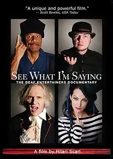 See What I'm Saying: The Deaf Entertainers Documentary is a 2010 feature documentary produced and directed by Hilari Scarl.[1][2] It focuses on the lives of deaf entertainers Bob Hiltermann, TL Forsberg, CJ Jones, and Robert DeMayo and their attempts to cross over to mainstream audiences. These talented entertainers overcome great challenges on their way to personal triumphs and professional success.[3][4]