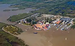 The creation and development of the Seespiele Mörbisch was dominated by considerations of tourism policy. When, from 1953 onwards, efforts were made to develop Burgenland's tourism and to transform the visiting and transit area into a place to stay and relax, Lake Neusiedl and the lakeside communities were at the centre of these efforts. In the municipality of Mörbisch am See, the road between Rust and Mörbisch was extended with strong support from the tourism department, an 1800 m long lake dam, which opened up Lake Neusiedl to visitors from Mörbisch, was built and a lido was constructed.[1] Mörbisch became the fourth important tourist community on the lake, alongside Rust, Neusiedl am See and Podersdorf am See. In 1956, the people of Mörbisch invited to a two-day Seefest. Together with the Austrian National Tourist Office, the community organised a so-called Night and Lake Festival, which was attended by 6000 guests. The programme offered night rides in decorated motorboats, music was provided by dance bands, Viennese artists performed a complete cabaret programme, and folk song and dance groups also performed.[2]