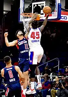 On 20 June 2019, Doumbouya was selected by the Detroit Pistons with the fifteenth pick in the 2019 NBA draft.[42] He became the first player born in Guinea to be drafted into the NBA.[5] On 4 July, he signed his rookie contract with the Pistons.[43] Doumbouya missed his team's first four games at the 2019 Las Vegas NBA Summer League with hamstring pain and scored nine points in his only appearance, during a 105–85 loss to the Brooklyn Nets.[44][45] In his rookie season, he was the youngest active player in the NBA.[46] He suffered a concussion during practice on 9 October and was sidelined for multiple games after being placed into the concussion protocol program.[47] On 4 November, before playing an NBA game, Doumbouya was assigned to the Pistons' NBA G League affiliate, the Grand Rapids Drive.[48] He made his G League debut four days later, scoring 12 points in a 109–94 win over Raptors 905.[49]