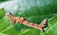 The larva is orange-brown or reddish brown, sometimes inclining to purplish; mepo- and metathorax enlarged laterally, 4th—5th abdominal swollen, with small dorsal humps; anterior segments marked with bright orange.