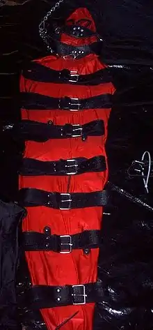 Self-bondage is characterized by experimentation and ingenuity, and can be riskier than conventional bondage. Self-bondage requires use of techniques for self-binding as movement becomes increasingly restricted as more restraints are applied, and also requires a reliable release mechanism. Many types of bondage equipment can be applied before the one that restrains the hands. For example, leg irons can be applied, as well as gags, blindfolds, etc.