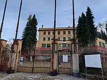 Main building at Sciesopoli in 2022, with plaque in context