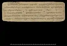 While the terms "Mind Section" (Tib. sems sde) and "Mind Orientation" (Tib. sems phyogs) are not attested prior to the 11th century (and are thus not found in the earliest Dzogchen texts), they are used by Tibetan and Western scholars retroactively to refer to a class of texts.[1] The most of important of these are the "Eighteen Great Scriptures" (Lung-chen bco-brgyad), which came be to called "mind series" (sems de) texts at a later date.[3] Five of these texts, the "five early translations" (snga ’gyur nga), are perhaps the earliest of these, and are attributed to the monk Vairotsana of Pagor.[19] Manuscripts of some of these texts have been found in the Dunhuang caves.[20] They include The Cuckoo of Awareness (Rig pa'i khu byug), The Small Hidden Grain (gSangs rgyas sbas pa), Questions and Answers of Vajrasattva and Gold Refined from Ore (rdo la gser zhun).[21] According to Liljenberg, Gold Refined from Ore may be the earliest of these and could indeed have been written in India.[22]