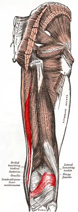 The semimembranosus muscle, so called from its membranous tendon of origin, is situated at the back and medial side of the thigh. It is wider, flatter, and deeper than the semitendinosus (with which it shares very close insertion and attachment points).[1] The muscle overlaps the upper part of the popliteal vessels.