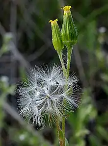 The flower head is urn-shaped and covered in phyllaries. The head opens slightly at the top, revealing many yellow disc florets and sometimes one or more tiny yellow ray florets, although these may be absent. The fruit is a long, thin achene coated in ashy gray hairs and tipped with a pappus of long, white bristles.