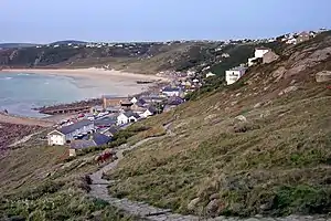 A small fishing fleet of seven is protected by a breakwater built in 1908.[10] Mullet used to be an important catch in the bay with the fishery beginning at the end of January and continued towards the end of April.[11] Sennen Cove was the most important seine fishery in Cornwall and, in Edwardian times, large schools were still entering the bay with as many as 12,000 caught at one time.[12] Seining continued into the 20th century with 1200 stone caught on 3 March 1977.[13]