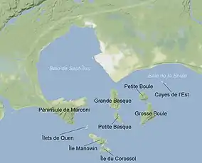 The Sept Îles Archipelago protects the mouth of the Sept Îles Bay on the north shore of the Gulf of Saint Lawrence about 250 kilometres (160 mi) east of Baie-Comeau and 250 kilometres (160 mi) west of Havre-Saint-Pierre. It is just north of the 50th parallel in Sept-Îles, in the Sept-Rivières Regional County Municipality of Quebec.[1] The bay lies between the Marconi peninsula to the west and Pointe aux Basques to the east. The islands are Petite Boule, Grosse Boule, Grande Basque, Petite Basque, île du Corossol, île Manowin and the îlets De Quen.[1]