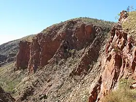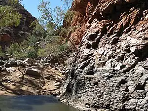It comprises two gorges created by a south flowing creek which has cut through two ridges of Heavitree Quartzite.[2] The gorge is home to some rare Central Australian plants such as the Centralian flannel-flower[3] and cycads (the Macrozamia macdonnellii). There is a semi-permanent waterhole guarding the entrance to the gorge.