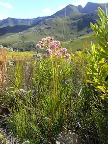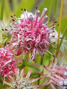 Serruria elongata or long-stalk spiderhead[3] is a plant belonging to the protea family. It is an erect, hairless shrublet of 1–1½ m (3½–5 ft) high with densely set, alternate, finely divided leaves lower down the plant, with needle-like segments. On top of an up to 30 cm (12 in) long inflorescence stalk are several, loosely arranged heads of pin-like, densely silvery-haired flower buds, each of which opens with four curled, magenta pink corolla lobes. The species is endemic to the southern Western Cape province of South Africa. It flowers during the southern hemisphere winter and early spring, between June and September.[4][5][6]