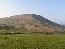 The hill at the end of Rushup Edge is over 500m high with clear views up the Hope Valley and across to Kinder Scout. Its name means Mother Hill. The hill is owned and managed by the National Trust.[14] The south east face is subject to continual landslides and the unstable A625 road across it was permanently closed after 1979 (so that all traffic now goes through Winnats Pass).[15] The updraft winds created by the steep face make the hill a popular location for paragliders. The Bronze Age hillfort and burial mounds are a protected Scheduled Monument.[16] |