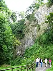This chasm is 245 feet (75 m) deep, making it the deepest pothole in Derbyshire. The entrance at the surface is 115 feet (35 m) long by 20 feet (6.1 m) wide. At the bottom is a cavern with a dome-shaped roof and stalactites. According to folklore the devil lived inside it.[17][18] |